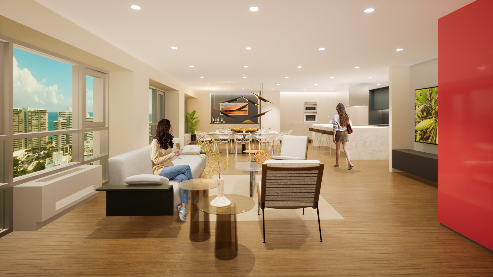 The completed project unites two formerly separate apartments—a one-bedroom unit and a two-bedroom unit—into a single, cohesive residence totalling approximately 2,287 square feet. Located on the 16th floor of Gallery Plaza Condominium, the original one-bedroom space, spanning approximately 950 square feet, faces north, capturing sweeping views of the Condado and Ocean Park skyline and the Atlantic Ocean. The adjacent two-bedroom unit, approximately 1,337 square feet, faces east, offering vistas of the Condado and Santurce urban landscape, while also sharing the north-facing ocean views.
